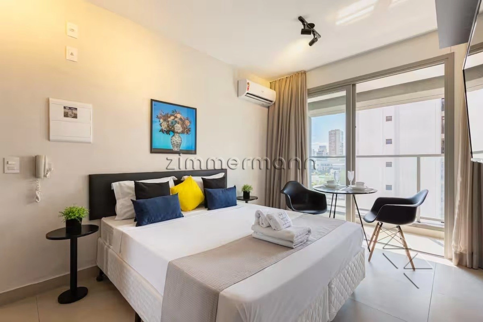Apartamento studio com 1 dormitório, living, cozinha integrada e banheiro social.